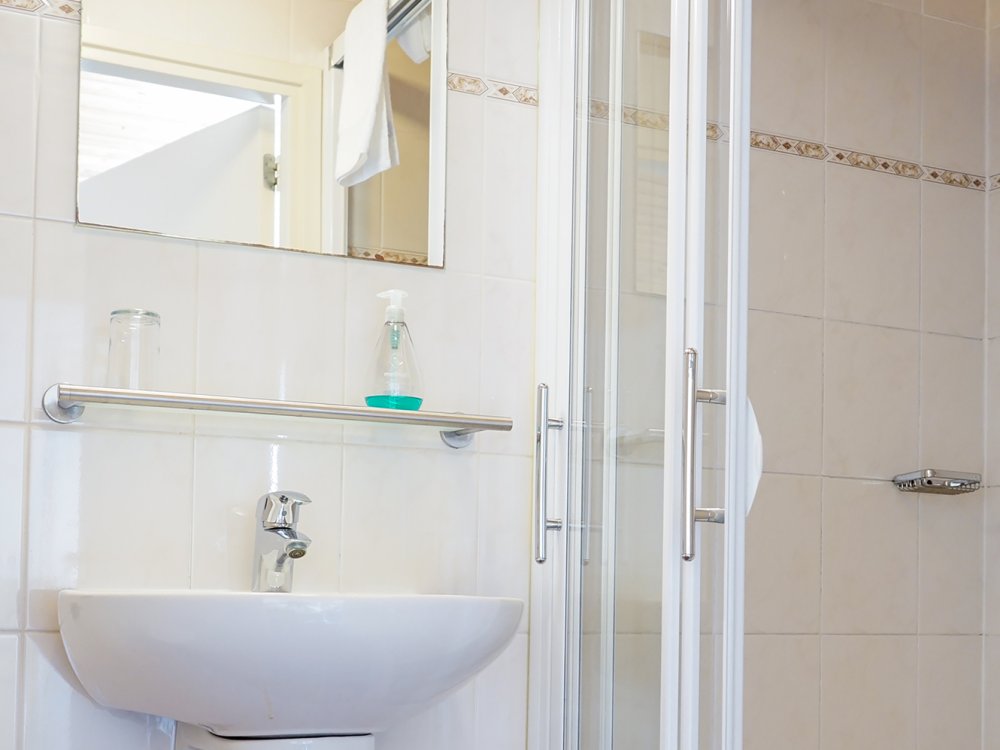 - Badkamer met douche, wastafel, toilet en föhn.